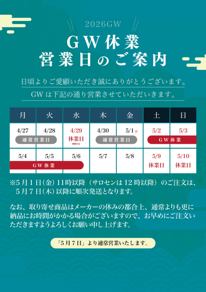 取り寄せ商品は、メーカー休みの都合上、通常よりも更に納品にお時間がかかる場合がございますので、お早めにご注文いただきますようよろしくお願い申し上げます。